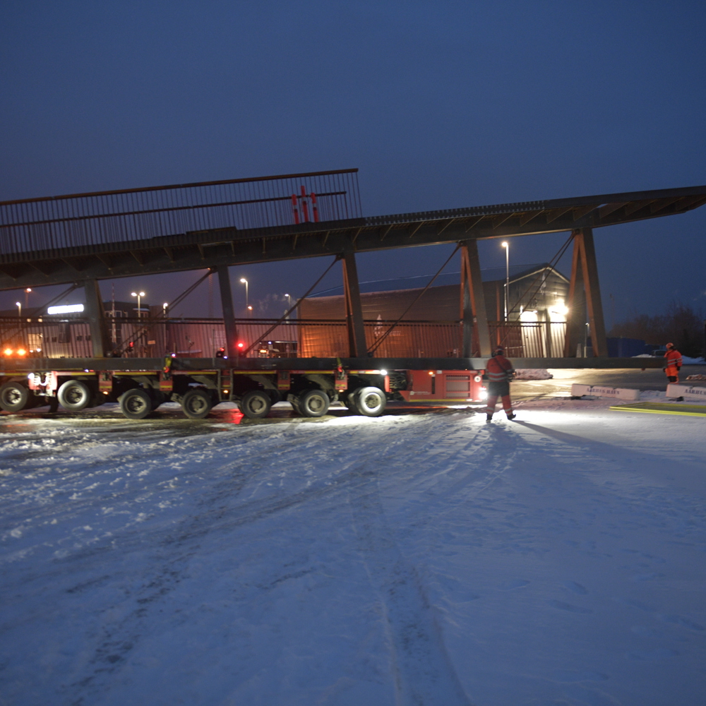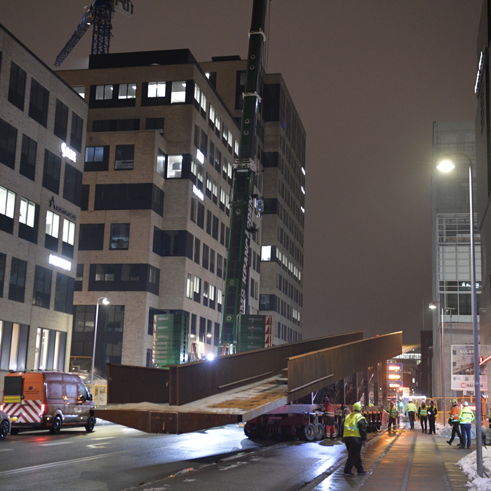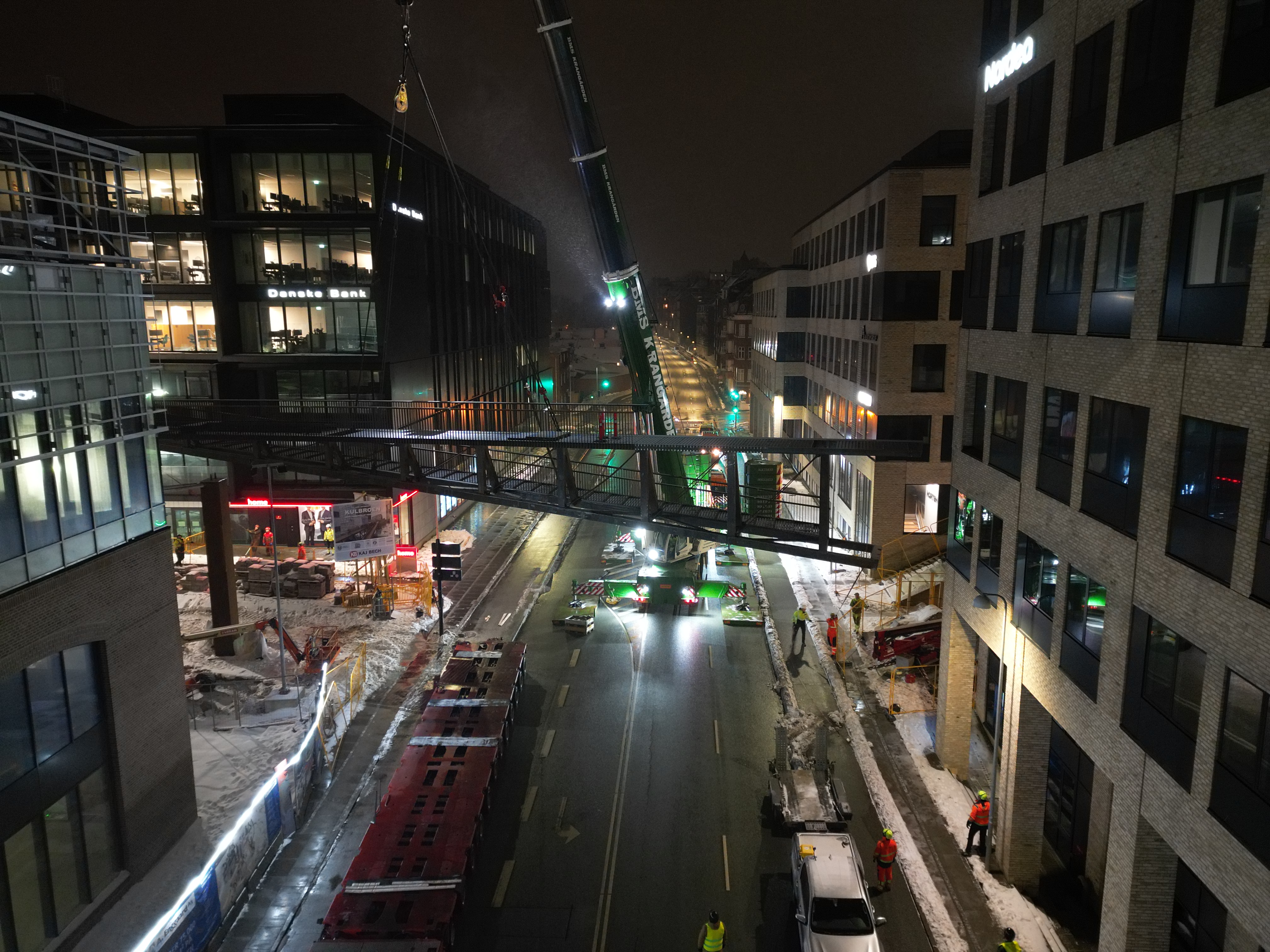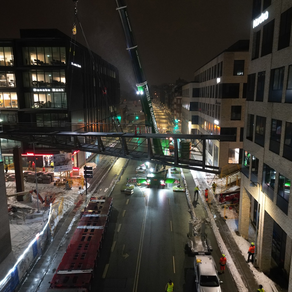 En 57 tons tung brosektion skulle transporteres gennem byen og løftes på plads mellem bygningerne ved Spanien. Opgaven krævede præcis planlægning, tæt samarbejde og det rigtige materiel.