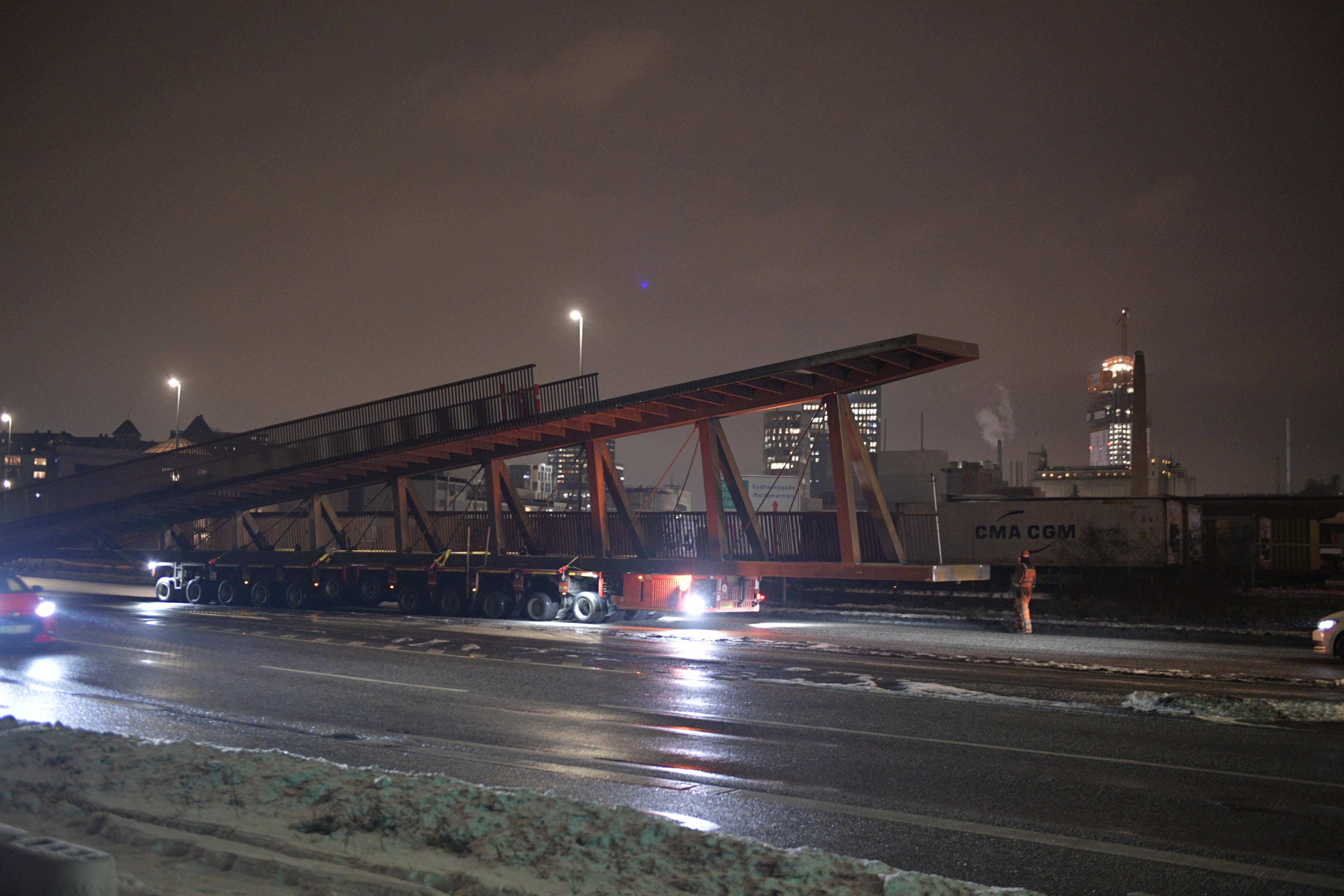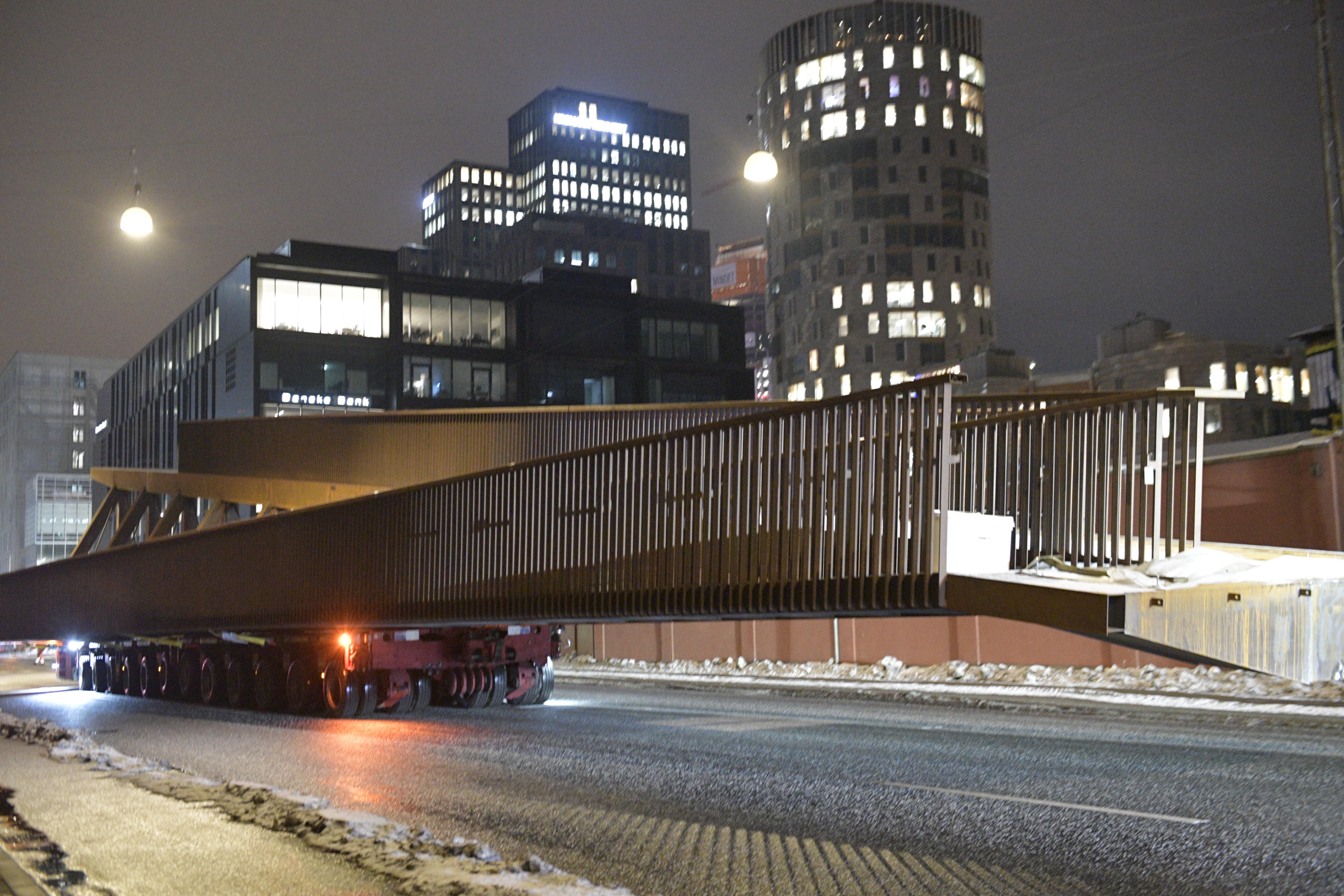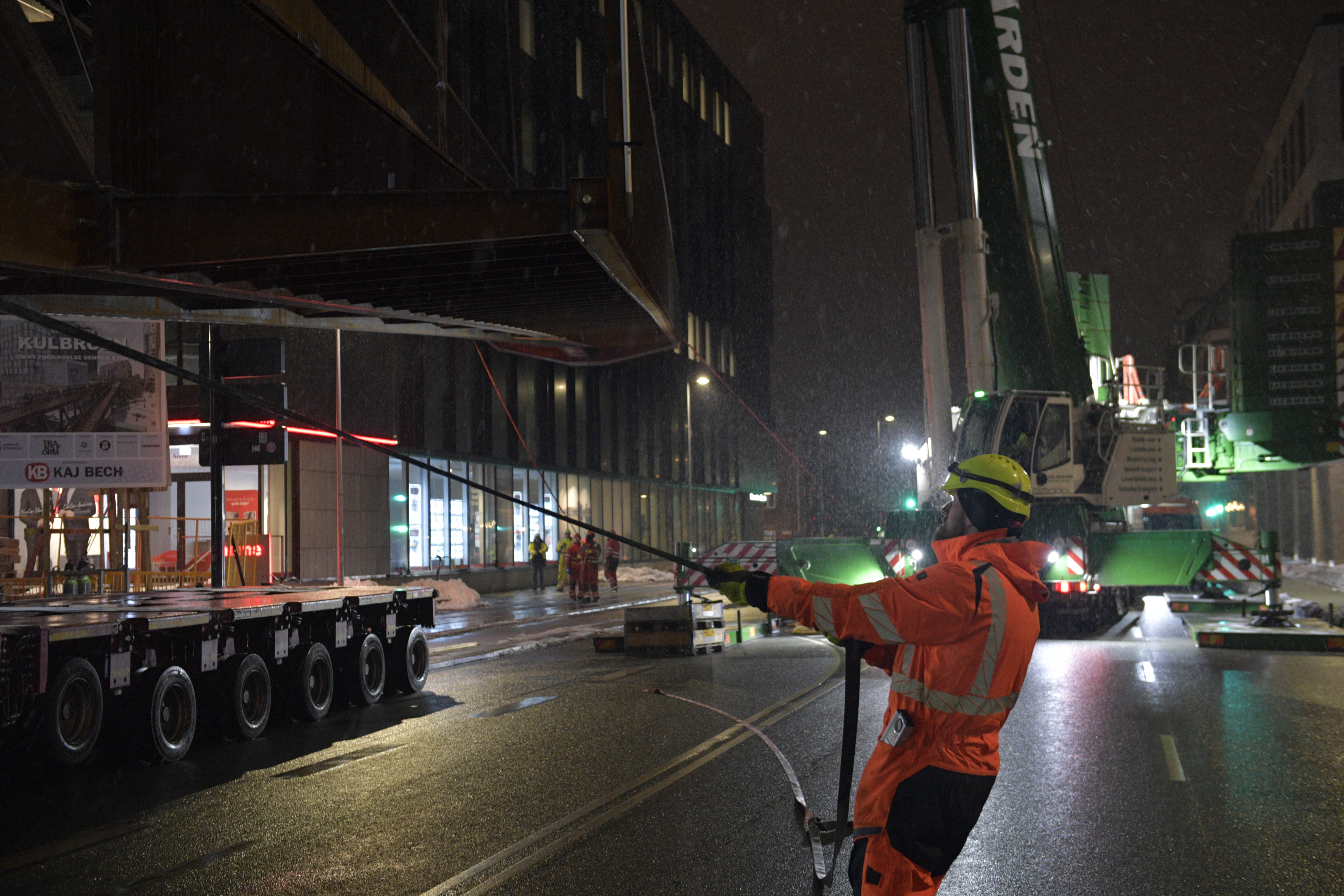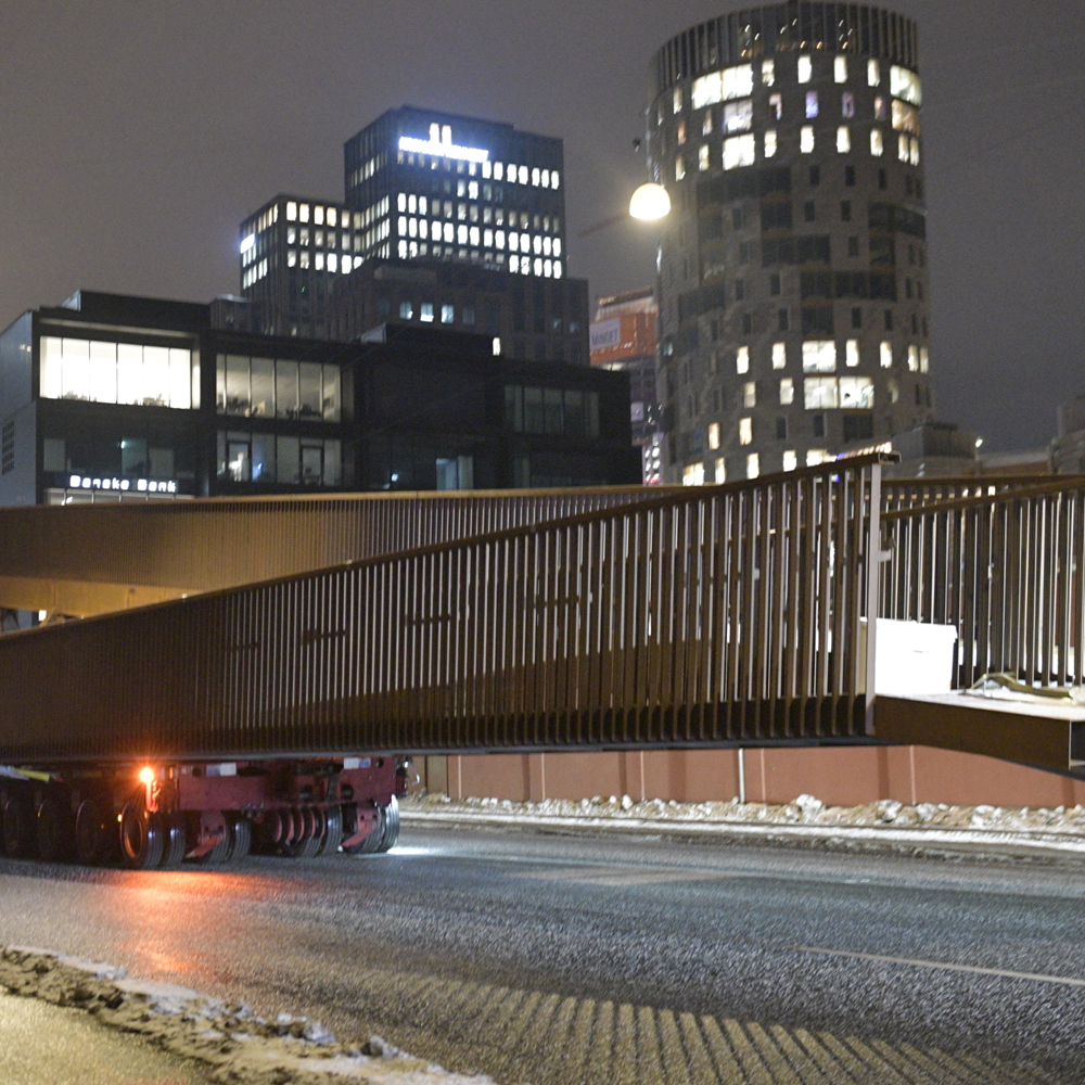En 57 tons tung brosektion skulle transporteres gennem byen og løftes på plads mellem bygningerne ved Spanien. Opgaven krævede præcis planlægning, tæt samarbejde og det rigtige materiel.
