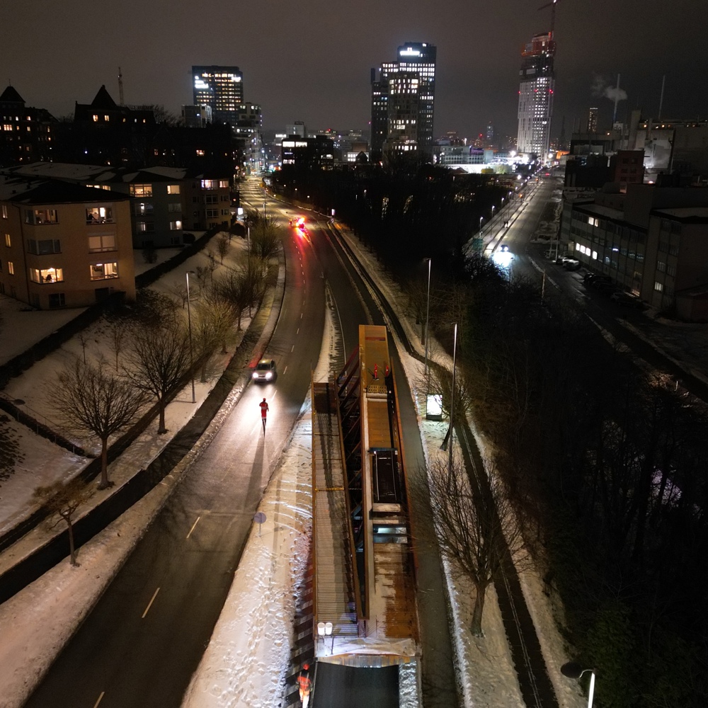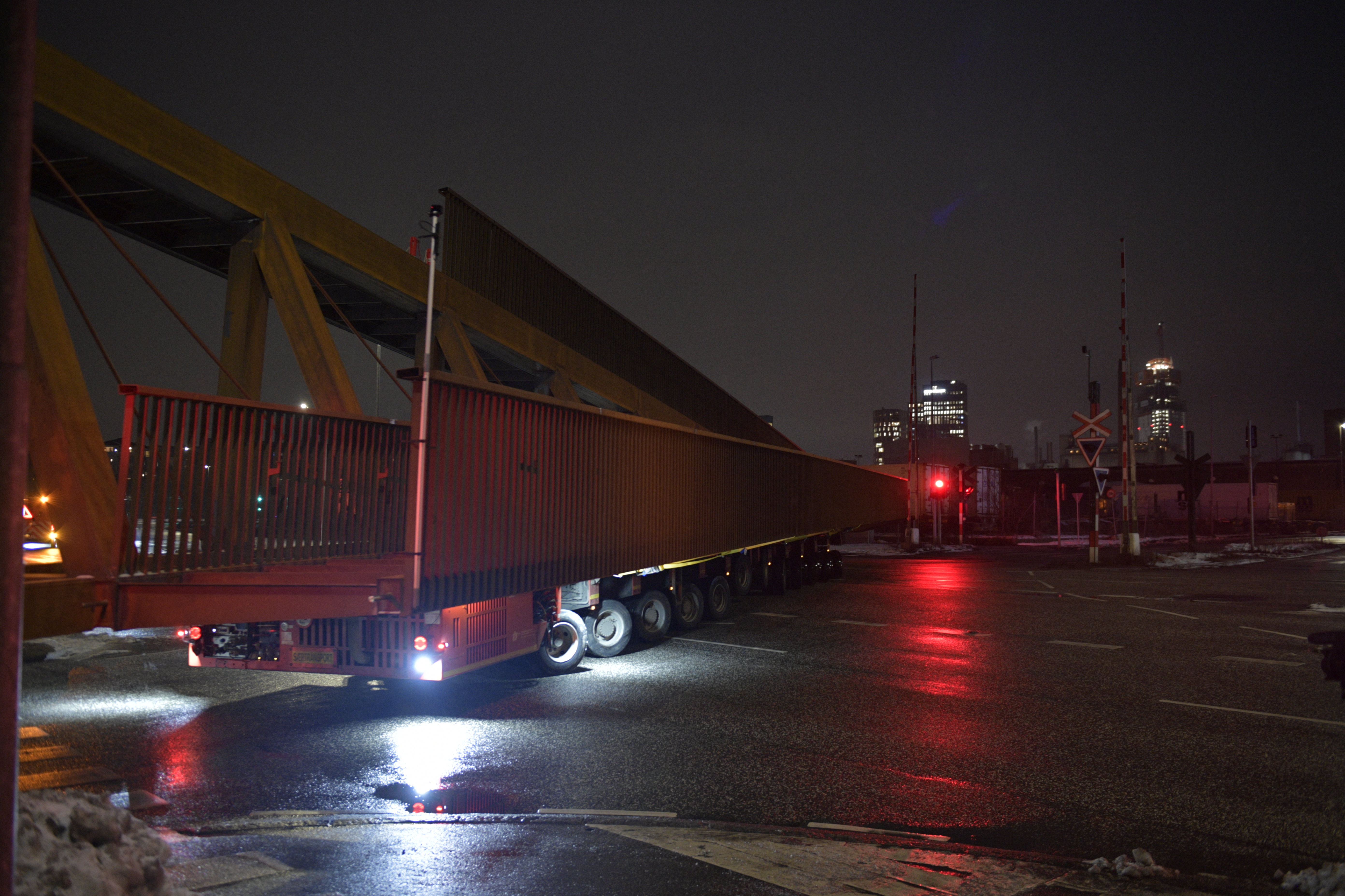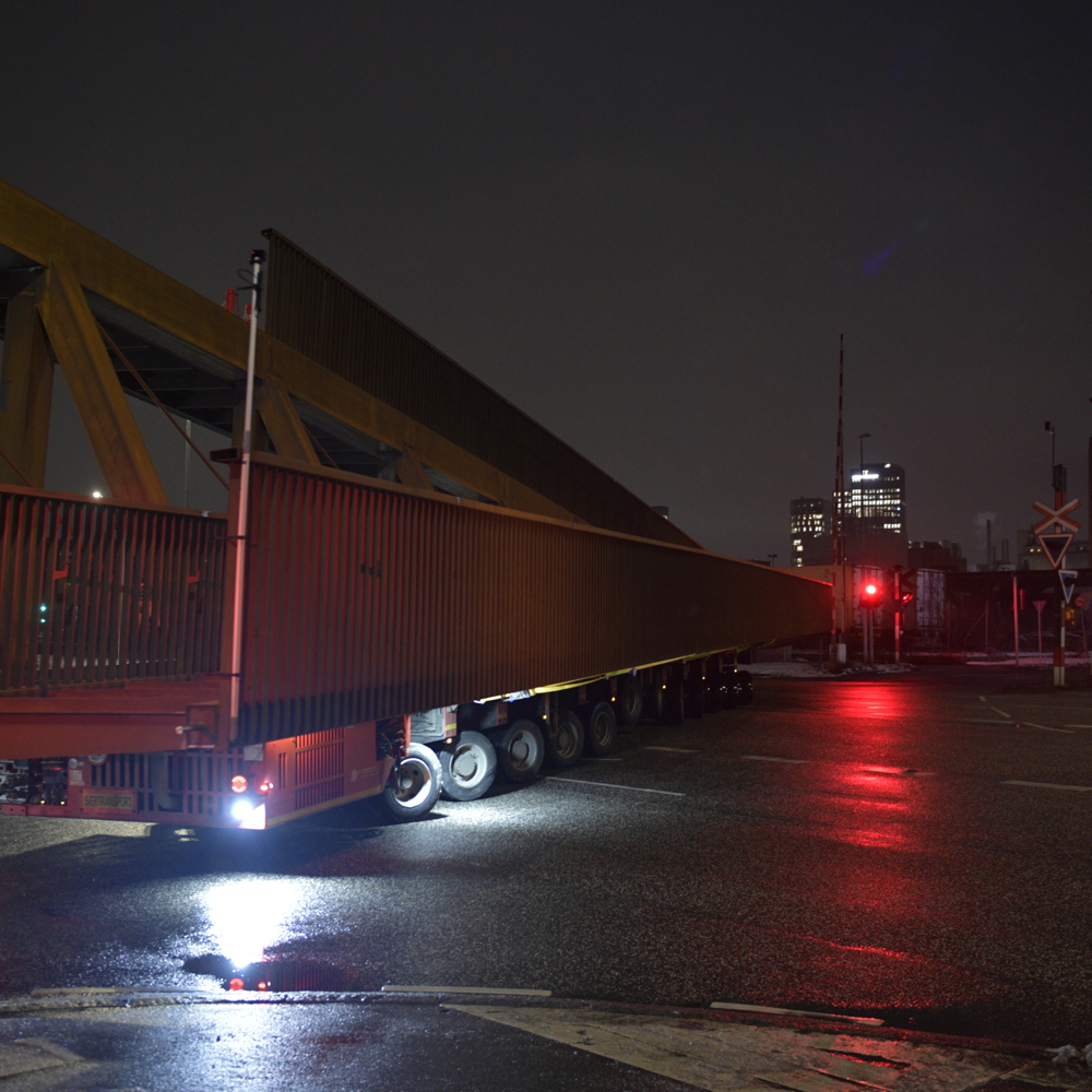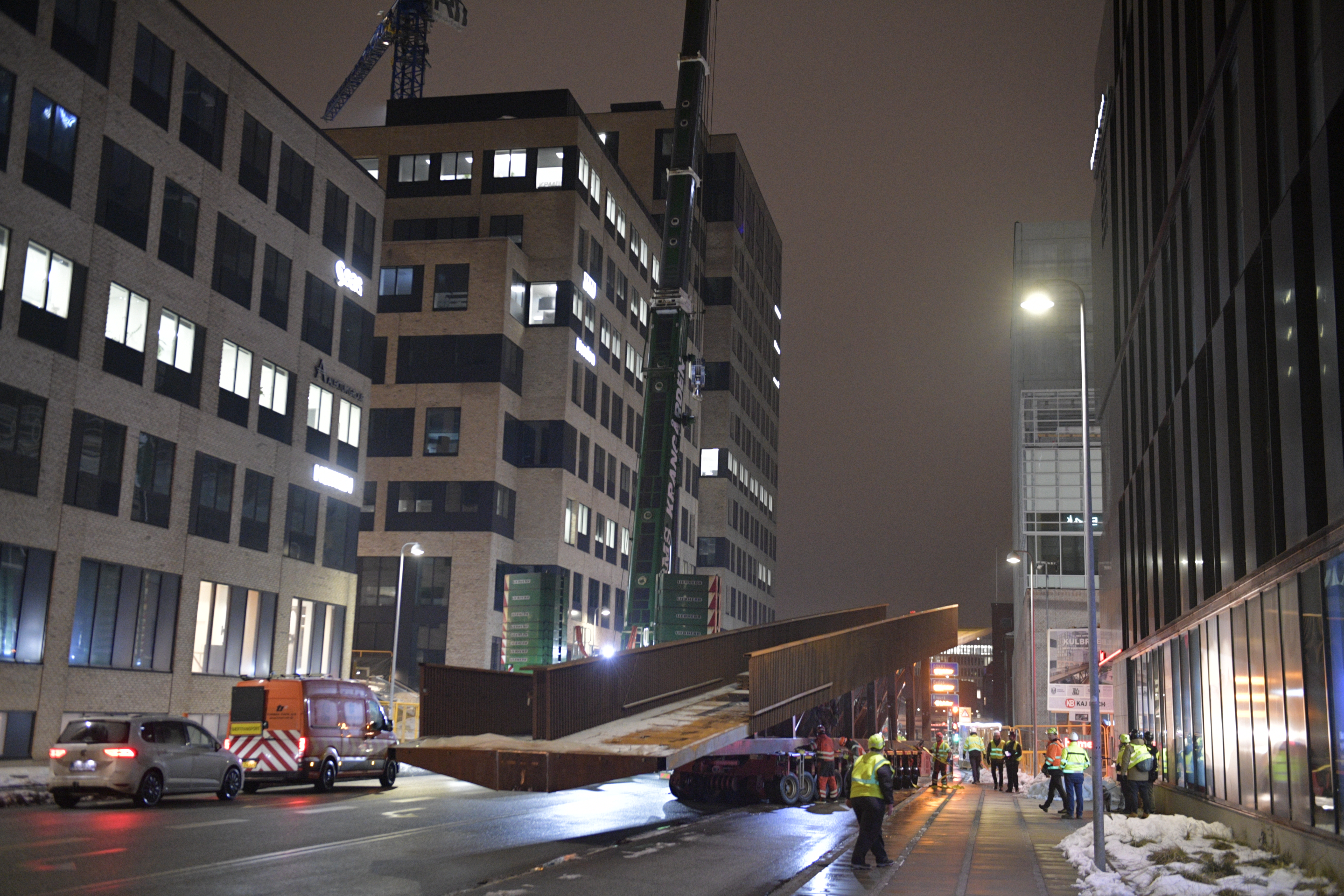 Brosektionen blev transporteret på SPMT af Torben Rafn. Med flere følgebiler og grundig koordinering blev den manøvreret sikkert frem til montageområdet midt i byen.