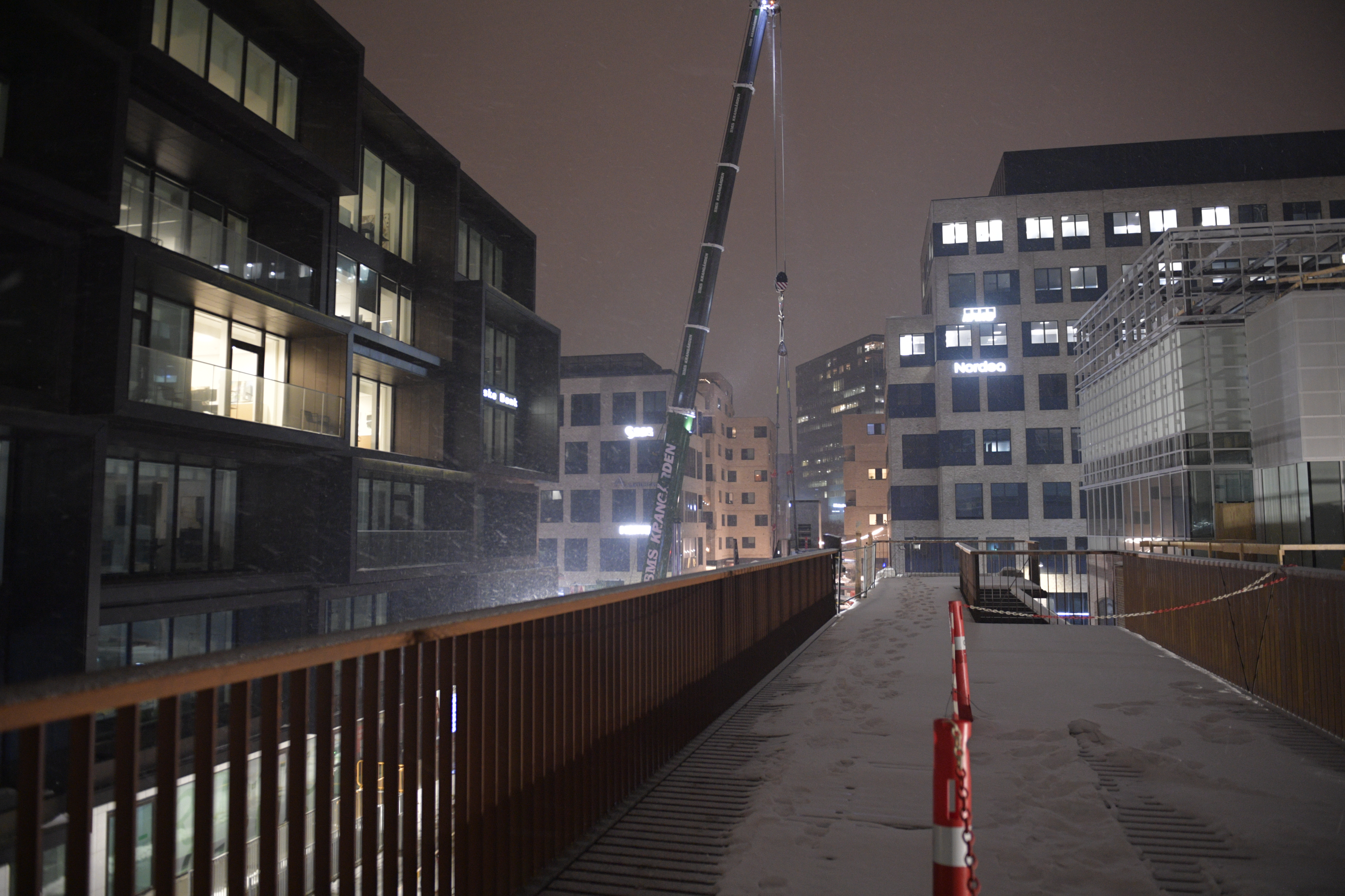 På pladsen stod vores 450 tons mobilkran klar til at løfte sektionen det sidste stykke op i højden og på plads.