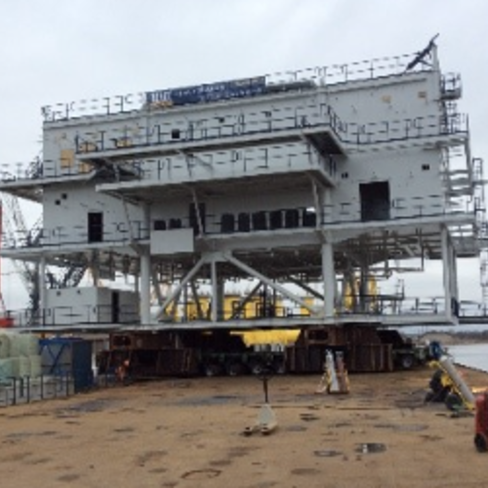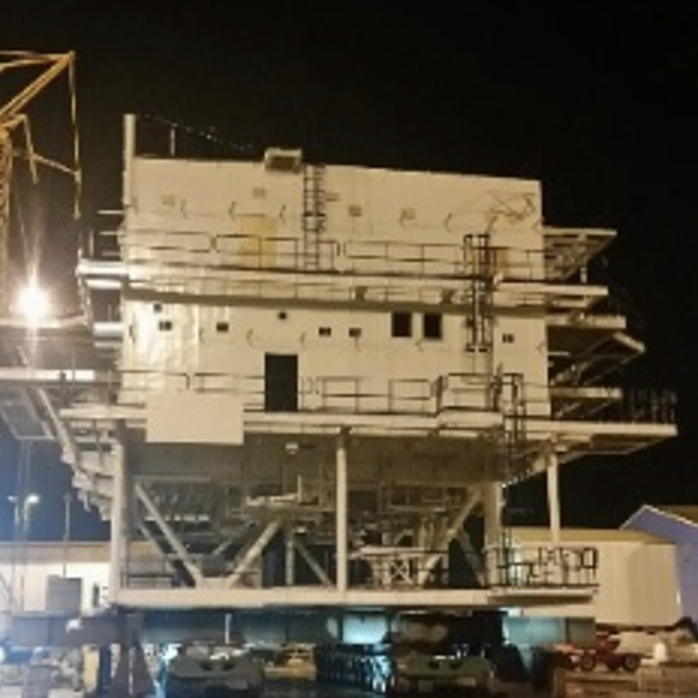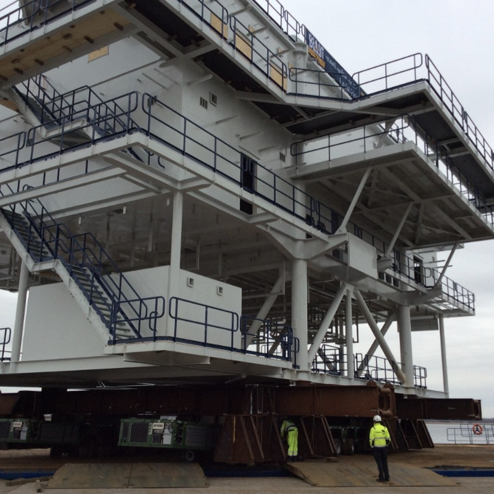 Aflæsning af et offshore topmodul med en længde på 30 meter, bredde på 25 meter, højde på 16 meter og en vægt på 550 ton.