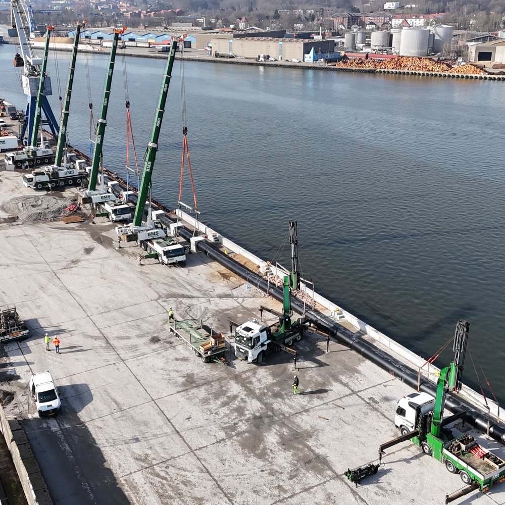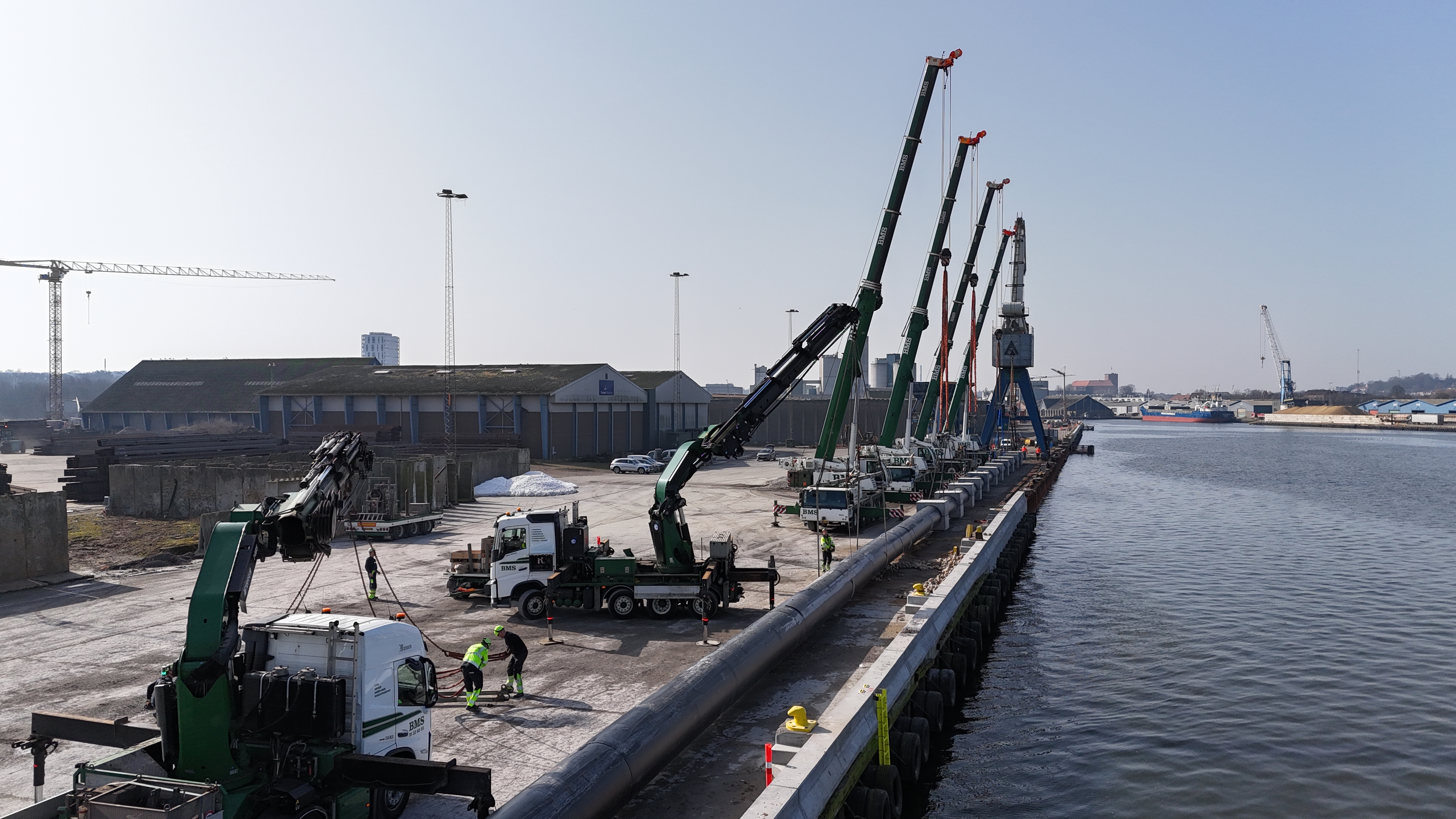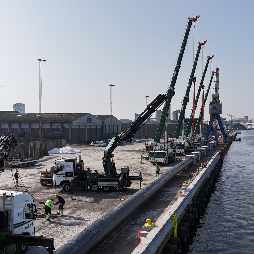 På Kolding Havn blev et 140 meter langt rør løftet på plads i et samløft med seks kraner. Den samlede vægt var 86 ton.