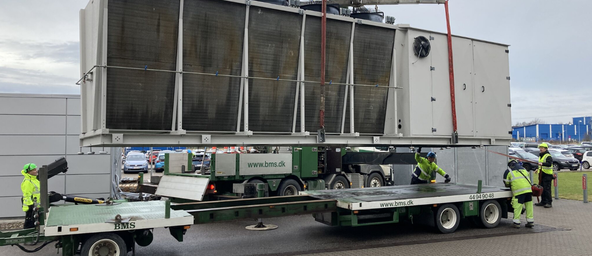 BMS har endnu engang løst en spændende kombineret transport- og hejseopgave – denne gang i Kalundborg. Med en 165 tm lastbilkran og en udtræksanhænger stod vi for transporten og løftet af en imponerende 11 meter langt køleanlæg på 8 ton.