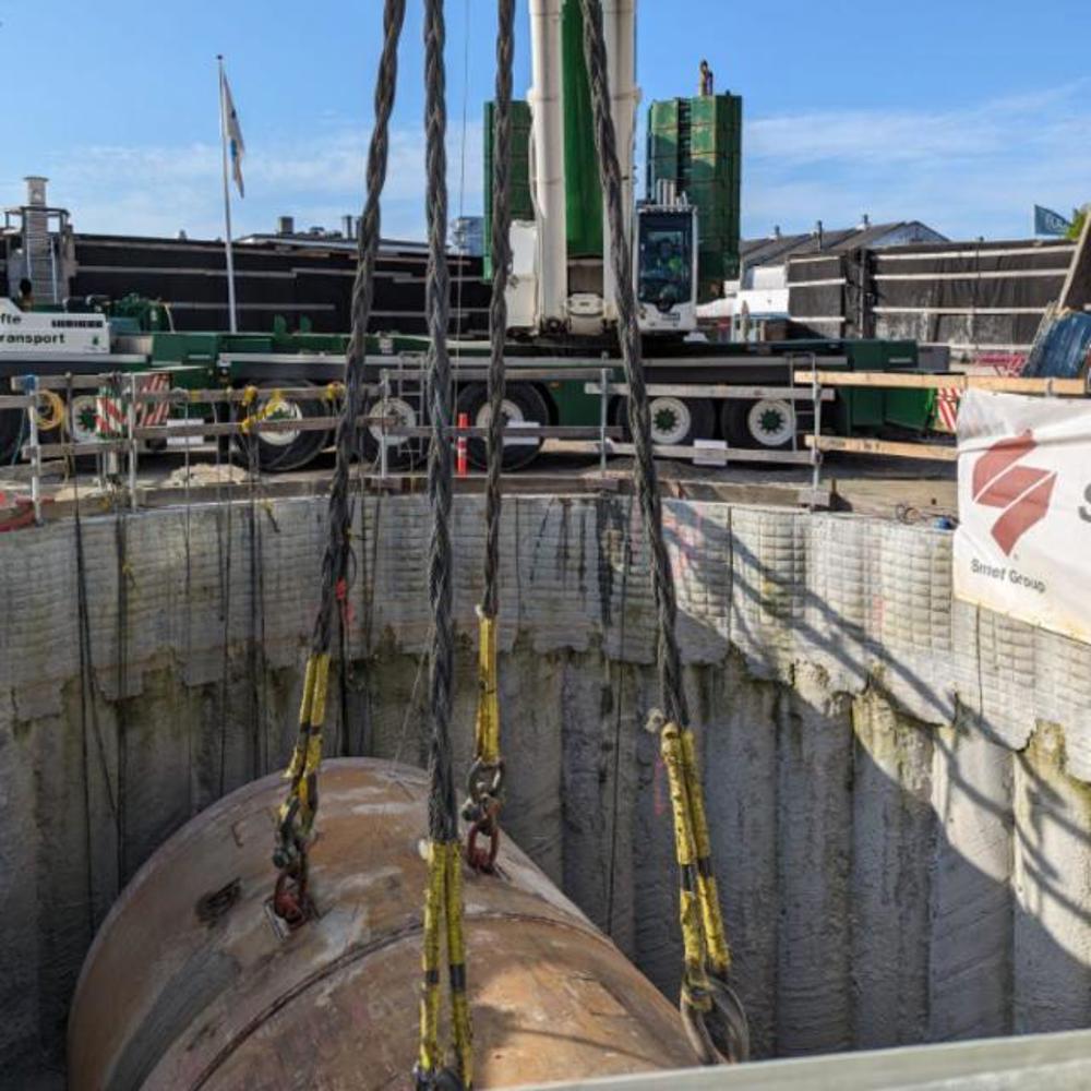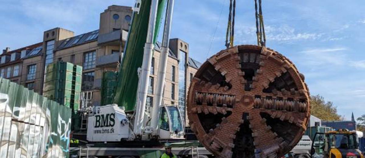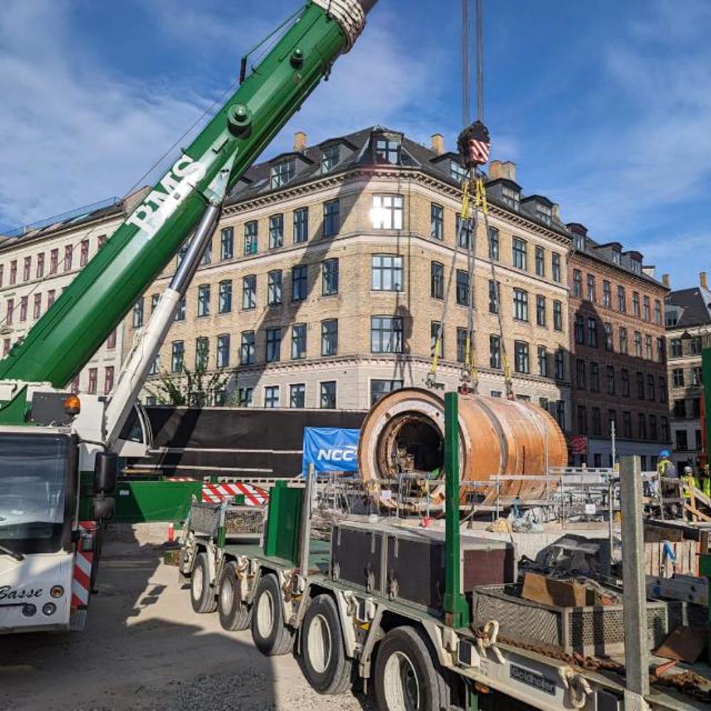 After months of work underground, the Sigrid tunnel boring machine saw the light of day again when “Basse” - our 450 TS Liebherr mobile crane - hoisted the 113-ton tunnel boring machine up through Halmtorvet