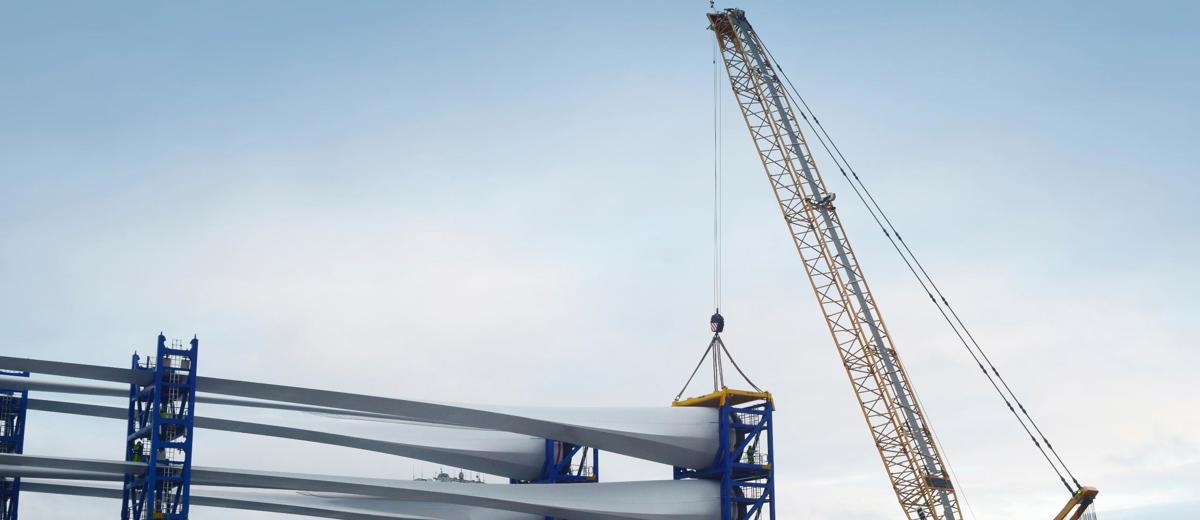 The task was to find a solution where it was possible to best place 12 80-metres blades on the dock in Nakskov so that they could be loaded onto a ship – without using the gantry crane from the Nakskov factory in con- nection with the loadout.