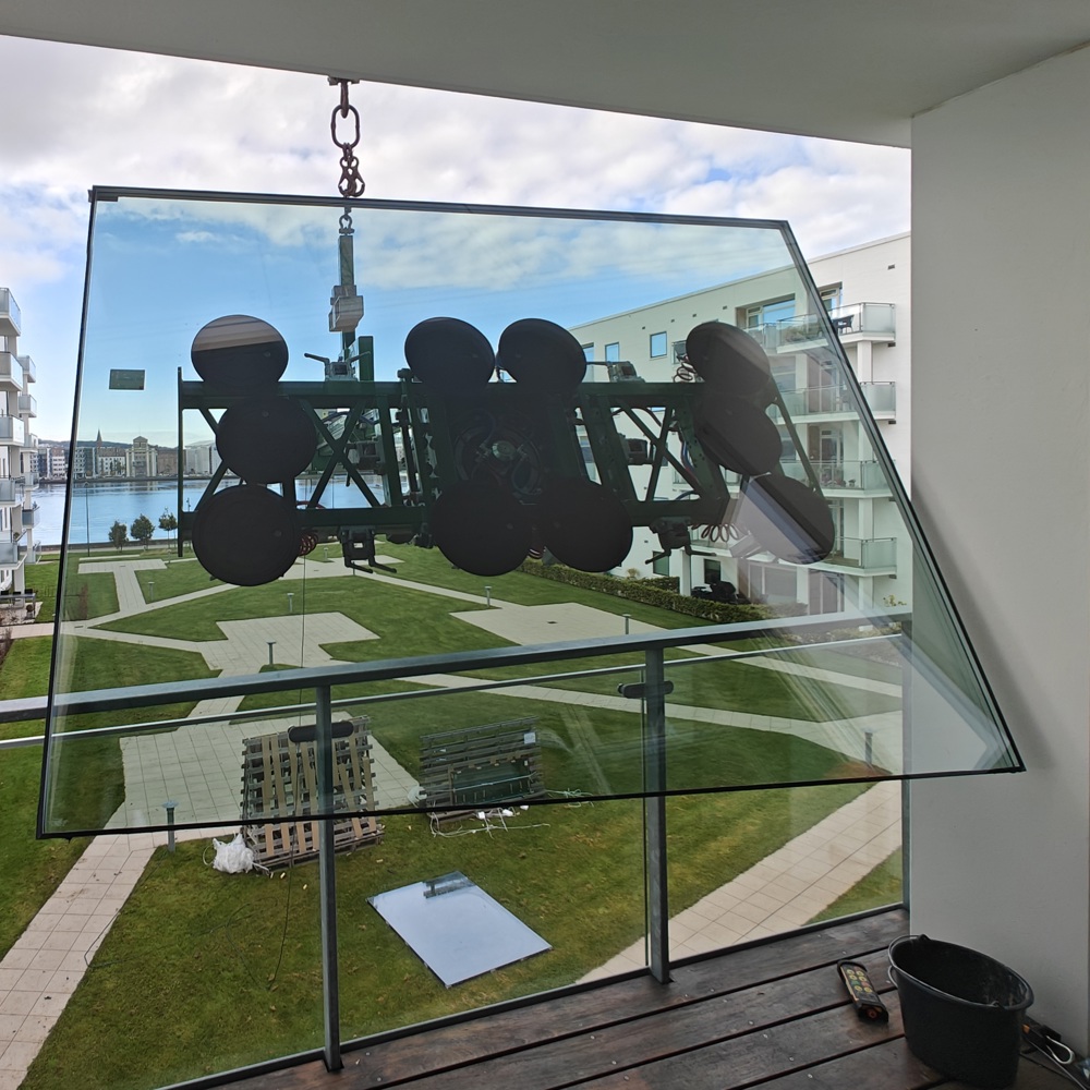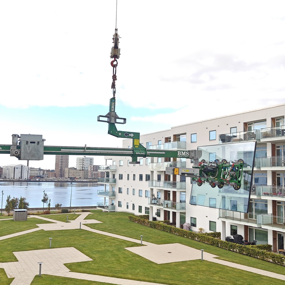 At BMS, no job is too tight or complex. Recently, we had to replace two large glass panes (2.4 x 2 m, approx. 240 kg) in apartments where traditional methods were not possible. The working area was limited by balconies, glass barriers and lack of crane access due to the underground parking underneath the building.