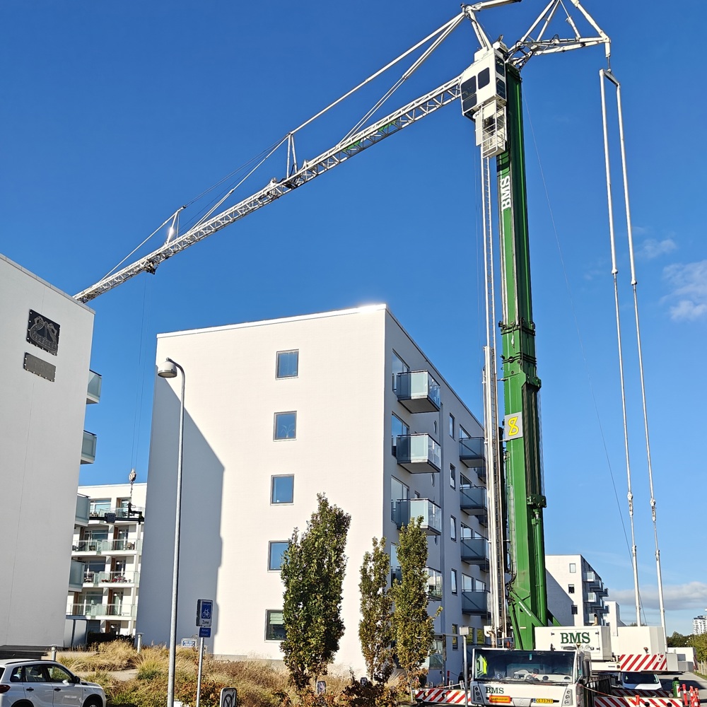 BMS balance beams can lift up to 12,000 kg under overhangs and reach 6 meters into buildings. For this task, a 2,500 kg balance beam with a 3 m reach was used, showing how our equipment can be adapted to even the most confined conditions.
