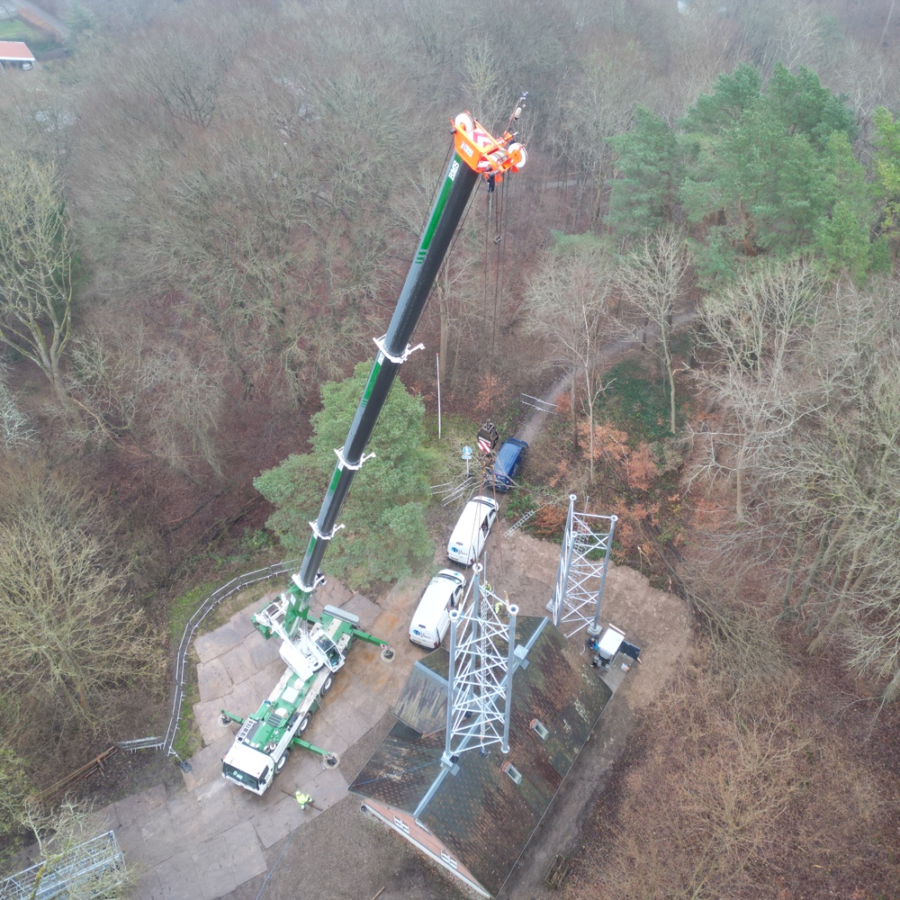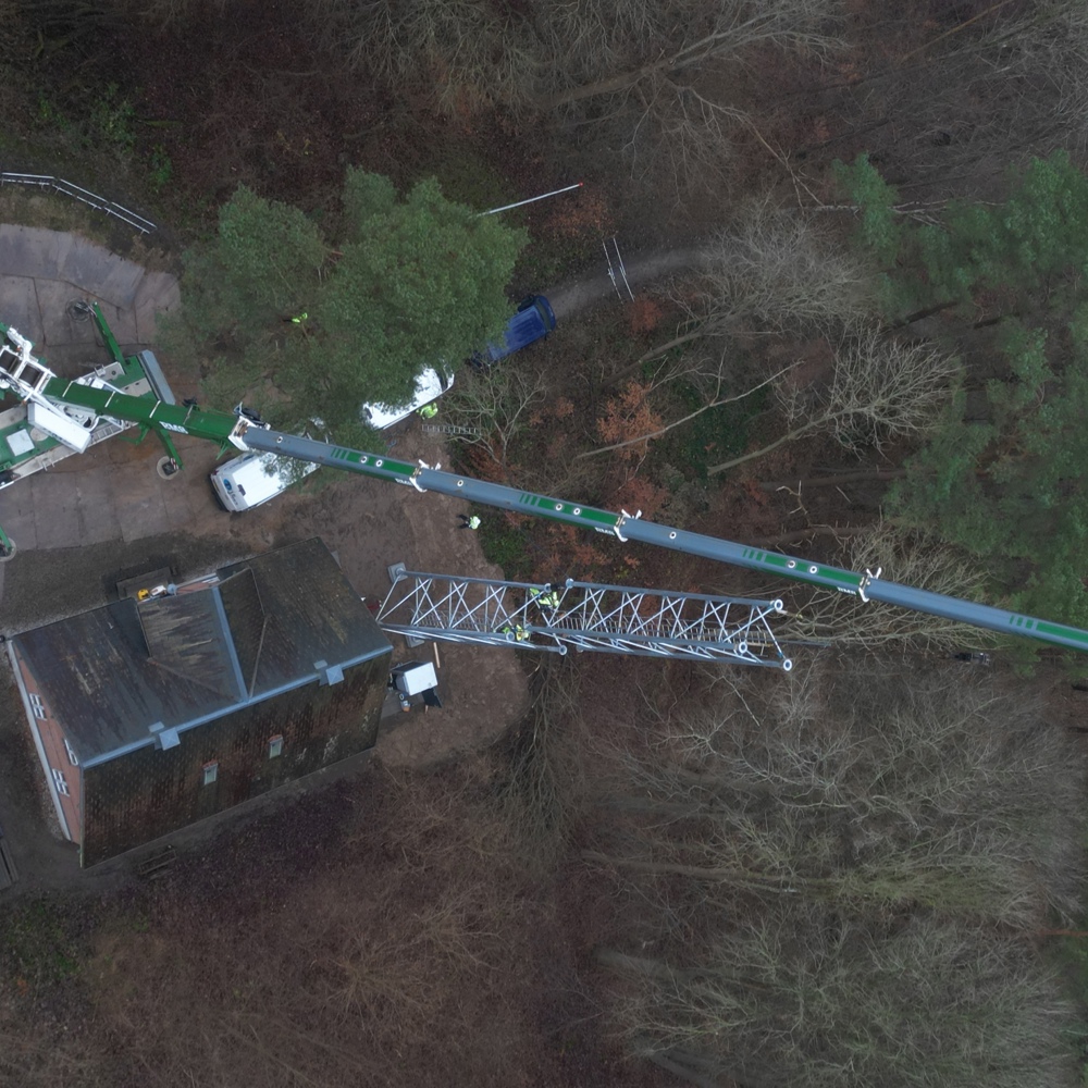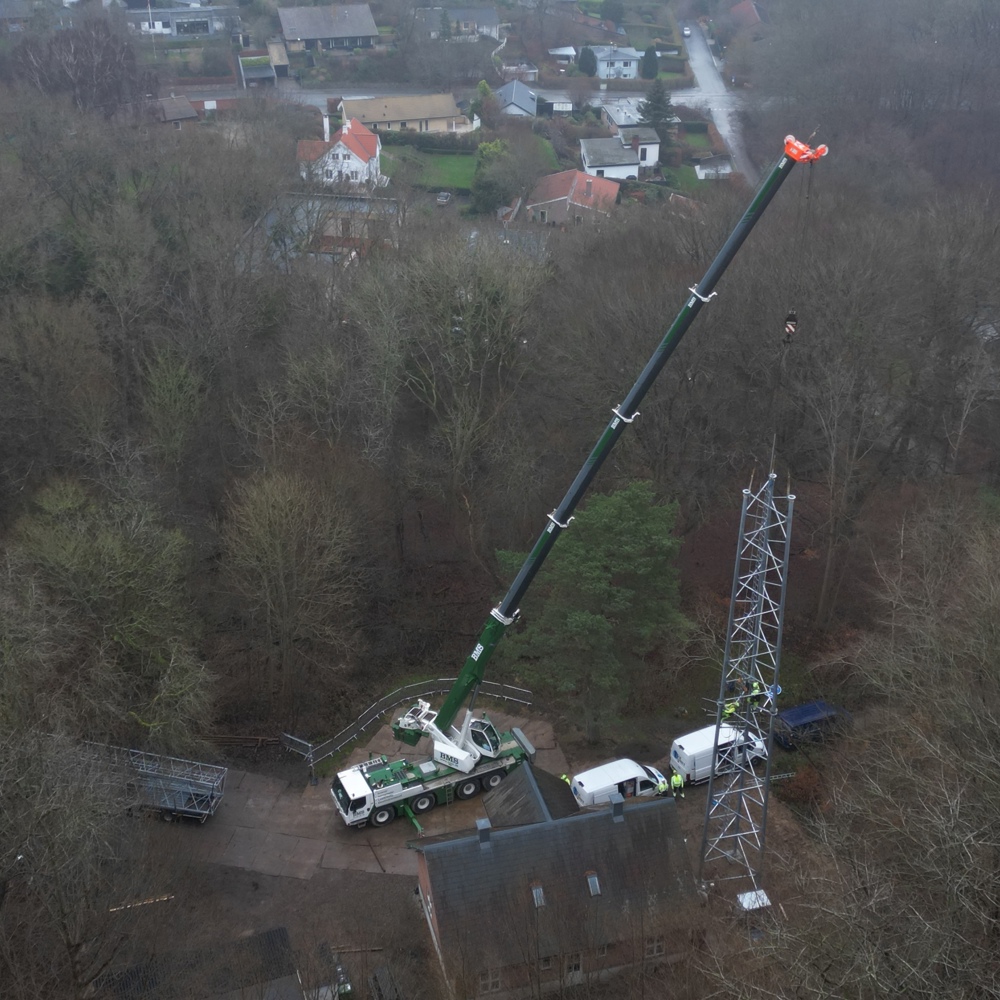 Hoisting of a mast on a site with very limited space in a small protected forest in Højbjerg, where tree felling was not permitted.