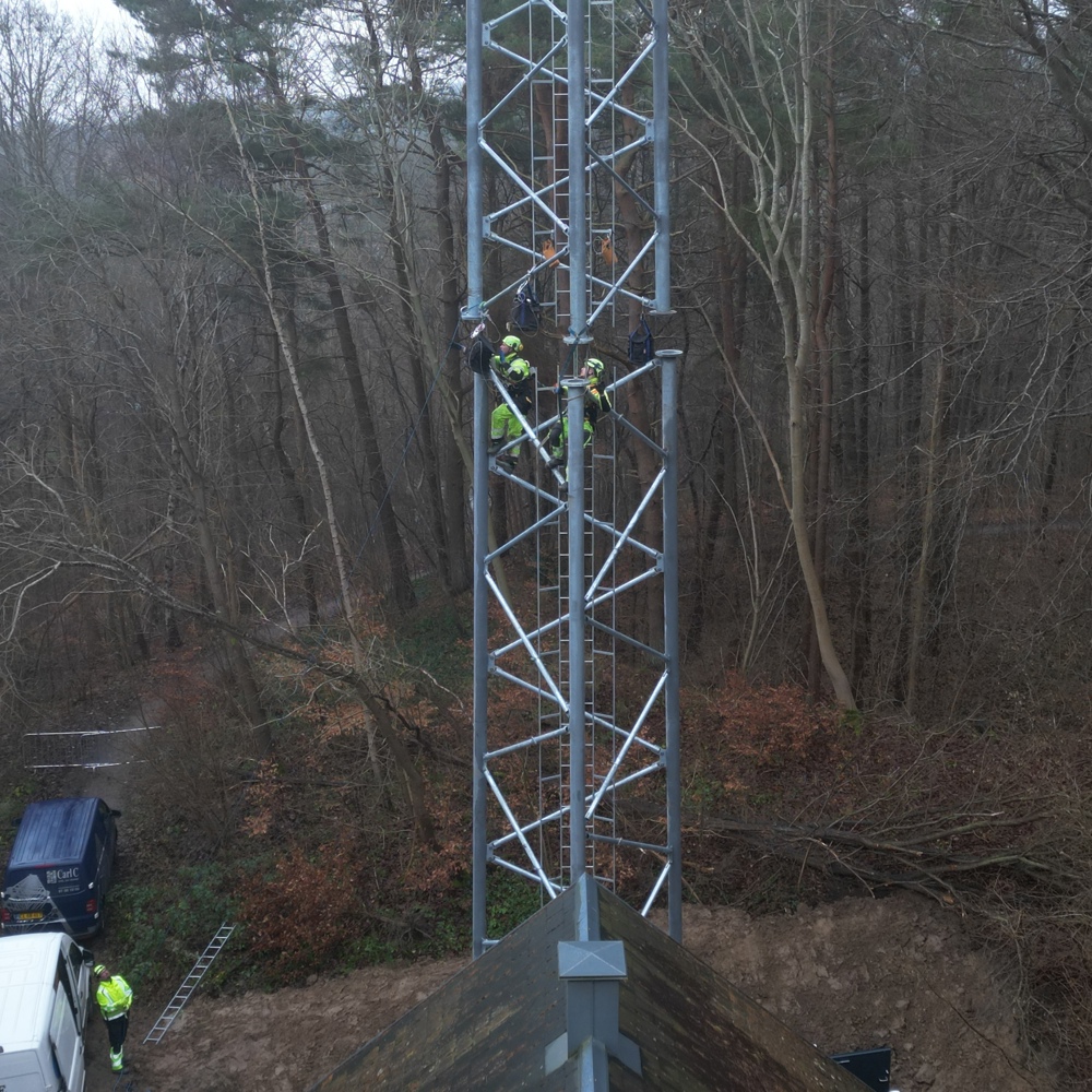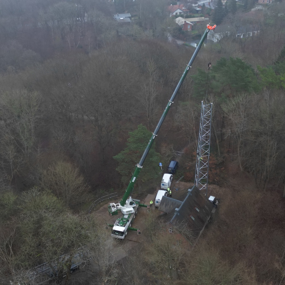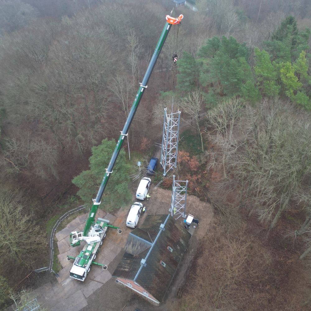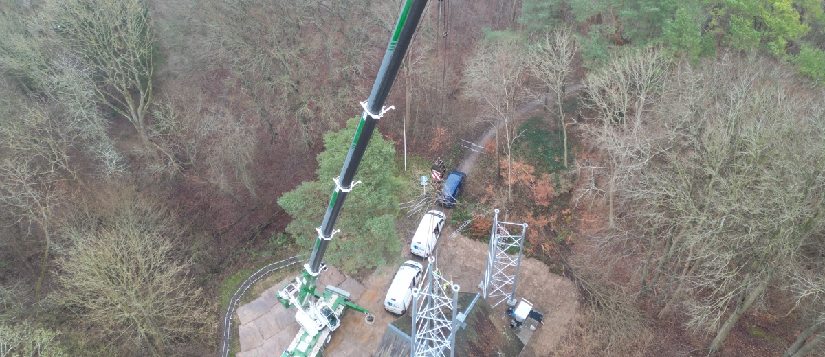 Hoisting of a mast on a site with very limited space in a small protected forest in Højbjerg, where tree felling was not permitted.